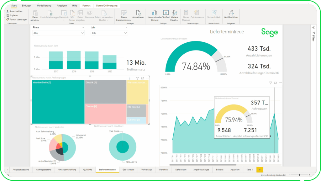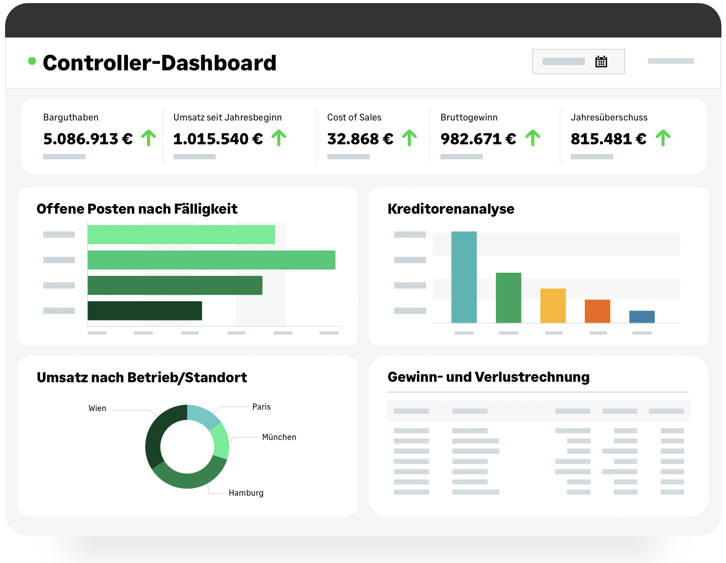 - Konfigurierbares Dashboard mit zentraler Übersicht aller geschäftsrelevanten Kennzahlen
